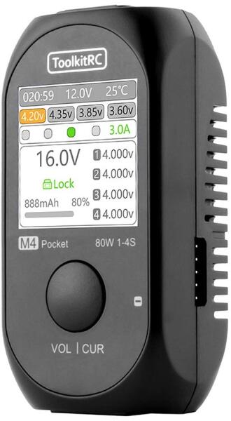 A ToolkitRC M4 Pocket aligha lehet kisebb. A lítium akkumulátorokhoz való M4 Pocket zsebtöltő olyan kicsi, hogy még a legszűkebb nadrágzsebben is elfér. Az akár 80 watt teljesítményű töltőnek nem kell rejtőzködnie. A felület által kínált kis hely optimális kihasználása érdekében a töltő mindössze egy gombnyomással vezérelhető, a két bemenetet és kimenetet pedig elegánsan eltolható burkolat borítja. Ami a kijelzőt illeti, az 1,54 hüvelykes színes kijelző határozottan további kényelmet kínál, különösen azért, mert az LCD-kijelző olvashatósága ugyanolyan jó, mint a normál méretű töltőké.